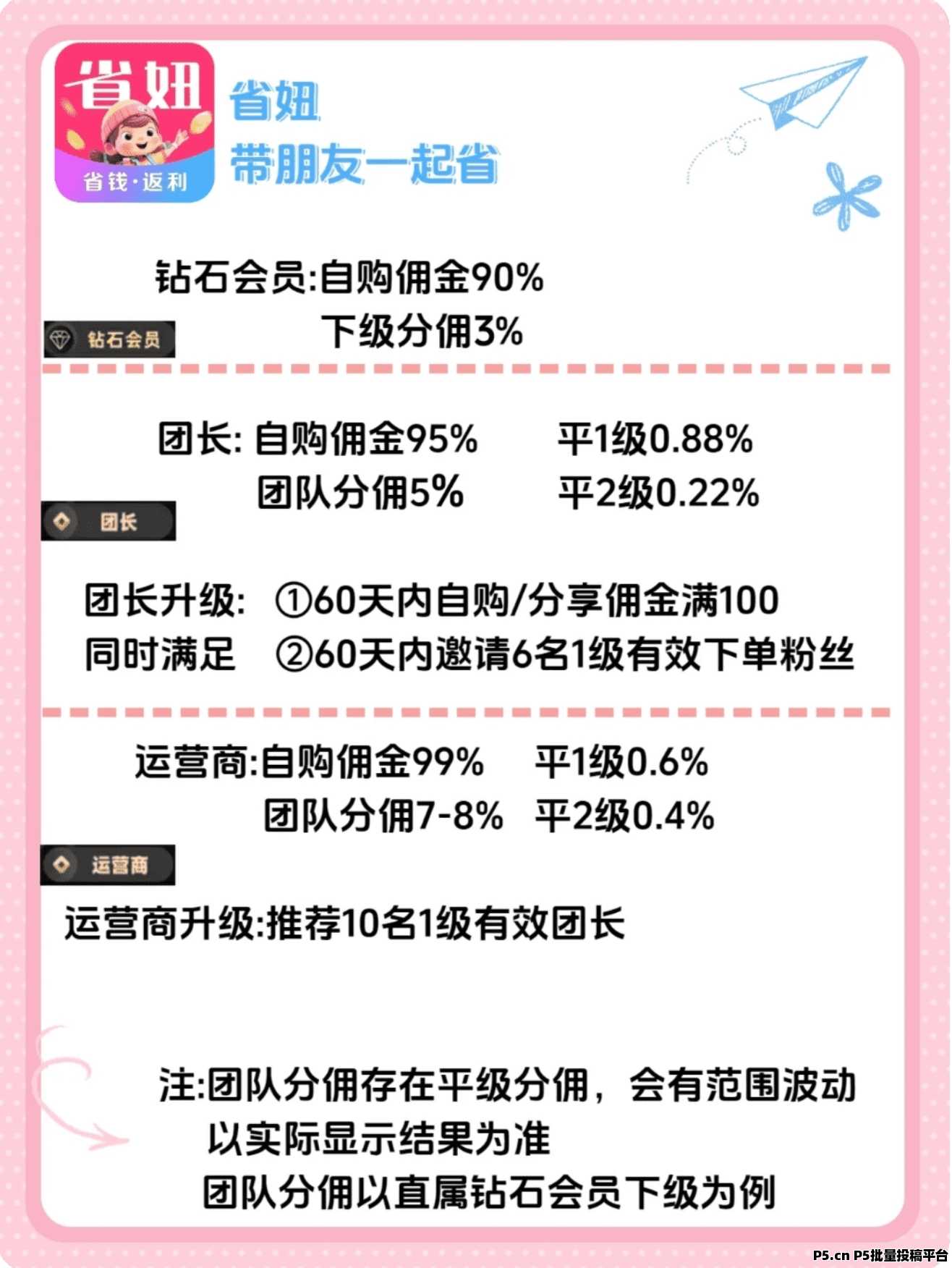 2. 团长:自购佣金94%,享团队分佣5-6%,平1级分成0.88%,平2级分成0.22%,团队裂变轻松增收