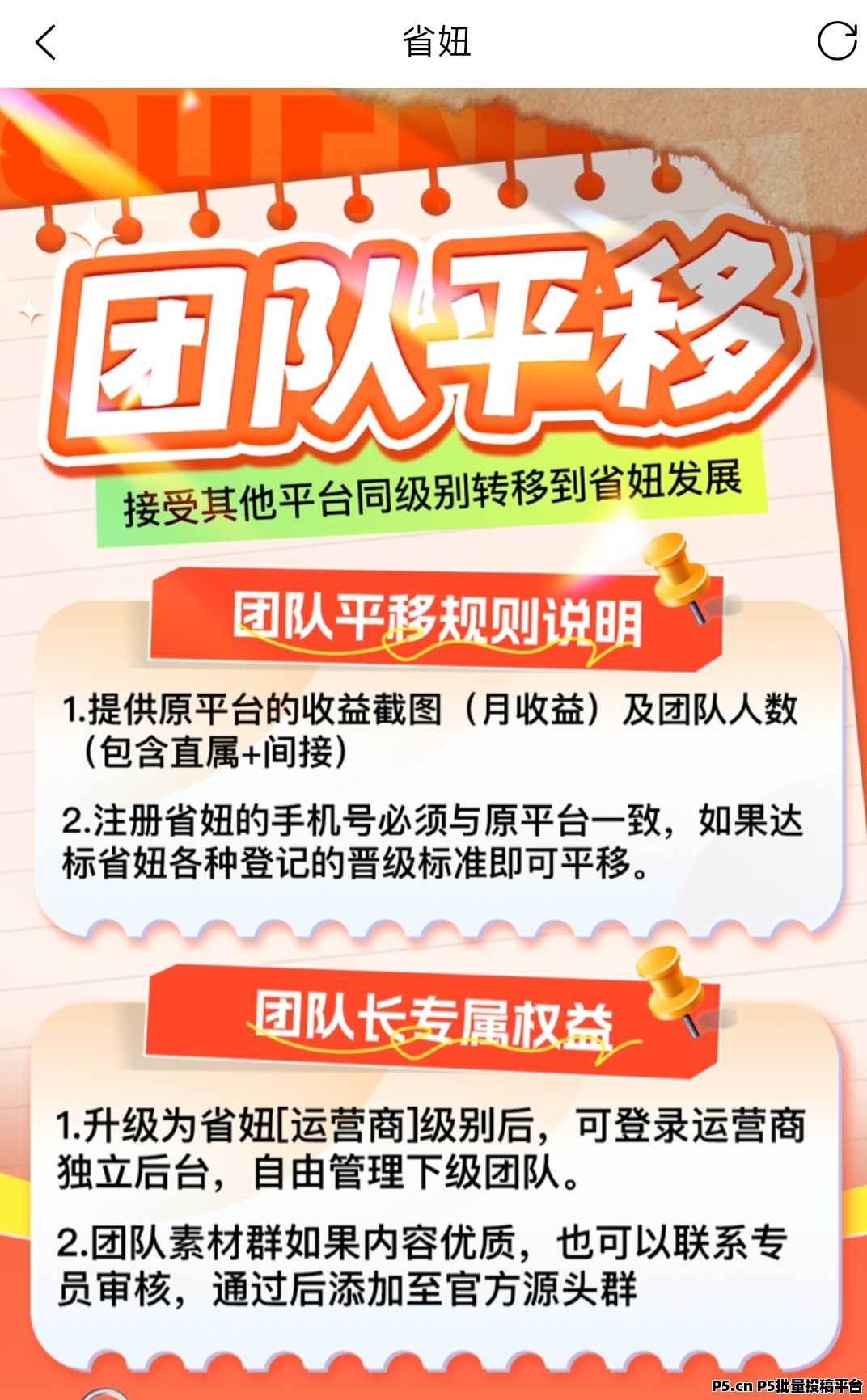 3. 扶持到位 轻松起量:支持其他平台同级别团队平移,现有团队可无缝对接,免去繁琐升级条件;官方提供全套素材、导师培训、运营扶持,小白也能快速起号,团队长可轻松放大收益。